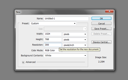- We start off by setting up the Photoshop document. At this point you need to decide on a few things. Besides setting the dimensions of the document, you also need to decide on the resolution. Depending on your deployment goals, the ideal resolution will change for the document. For print, you will need at most 300ppi, while 72ppi is okay for web graphics. In our example, we are using these document values: