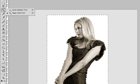 - The next step is to remove the white background from our model image. To do this, we use the “magic wand tool” located in the tools panel under the selection tools. We click on the white background area of our image to select it.